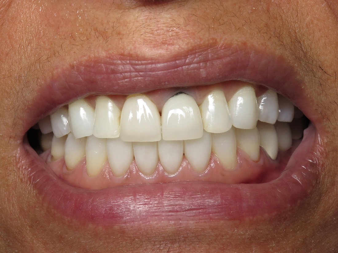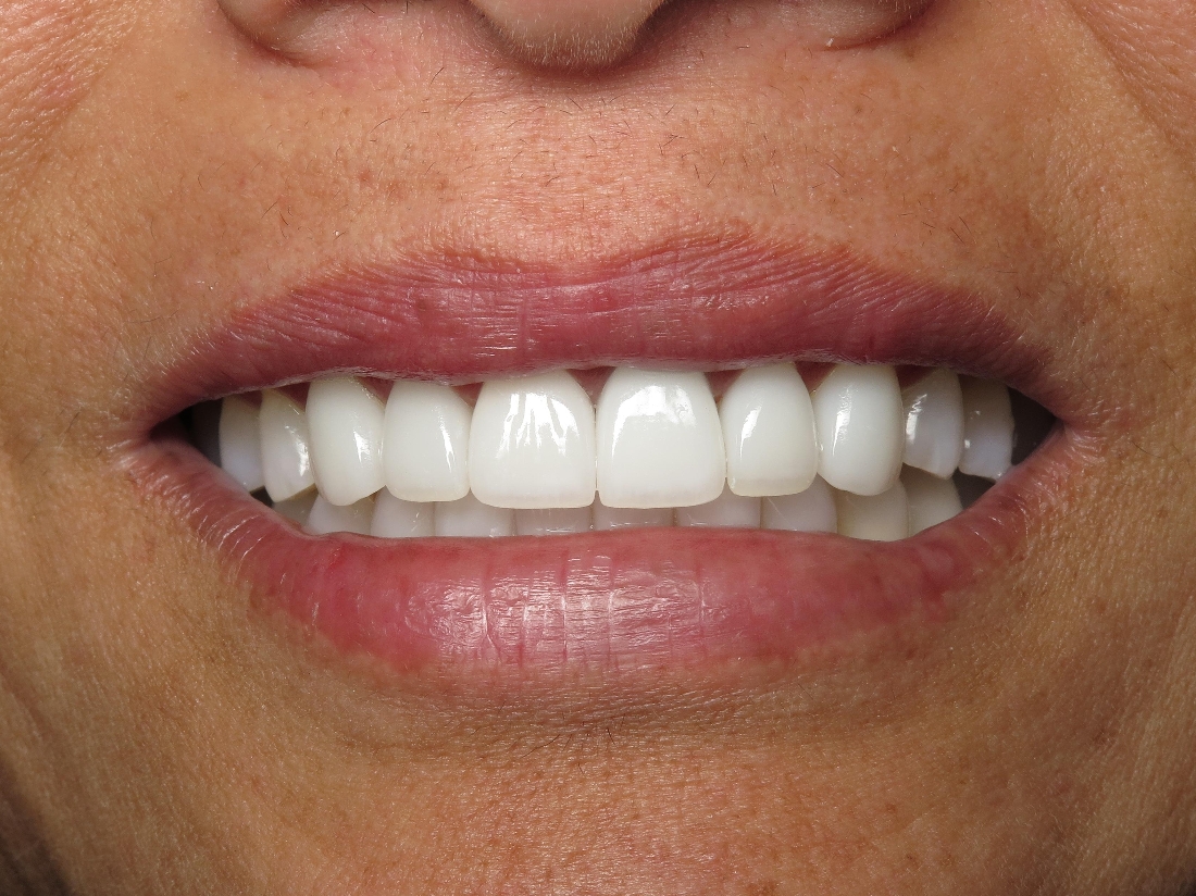 Patient had old porcelain crowns on her two front teeth and was looking for ways to improve her smile.. After consultation, the patients desires were to have a whiter and more youthful and feminine smile. Treatment consisted of two all porcelain crowns on her front teeth and 4 porcelain veneers on her other front teeth. Results were amazing!